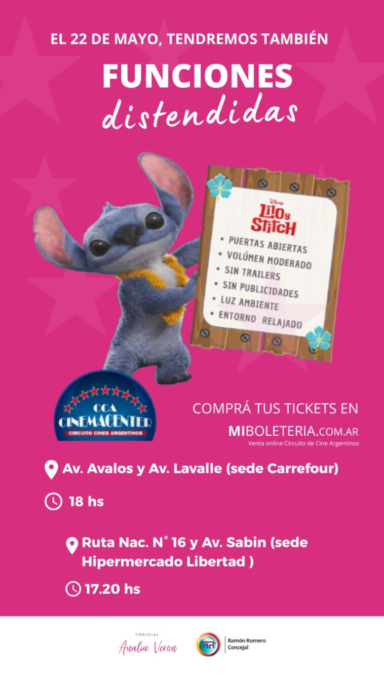 La concejal Analía Verón anunció el inicio de las funciones de Cine Distendido, una propuesta inclusiva, impulsada junto con su par Ramón Romero. La misma, está destinada a personas neurodivergentes, como aquellas dentro del espectro autista. Las proyecciones, están previstas para el jueves 22 de mayo en las salas de Cinema Center. La primera será en la sede de Hipermercado Libertad a las 17.20 hs. y la segunda en la sede de Carrefour a las 18 hs.