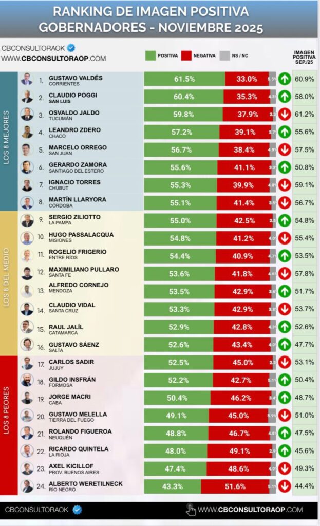 La medición se llevó a cabo entre el 1 y el 3 de noviembre, con entre 653 y 942 casos por provincia y un margen de error de entre el 3% y el 4%. La consultora evalúa mensualmente, desde 2020, la imagen pública de los 24 gobernadores del país.