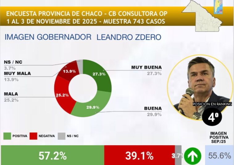 Un relevamiento realizado a nivel nacional por CB Consultora Opinión Pública ubicó al gobernador del Chaco, Leandro Zdero, entre los mandatarios provinciales con mayor imagen positiva del país. Según el informe, correspondiente al mes de noviembre, Zdero se posiciona en el cuarto lugar del ranking con un 57,2% de valoración positiva.